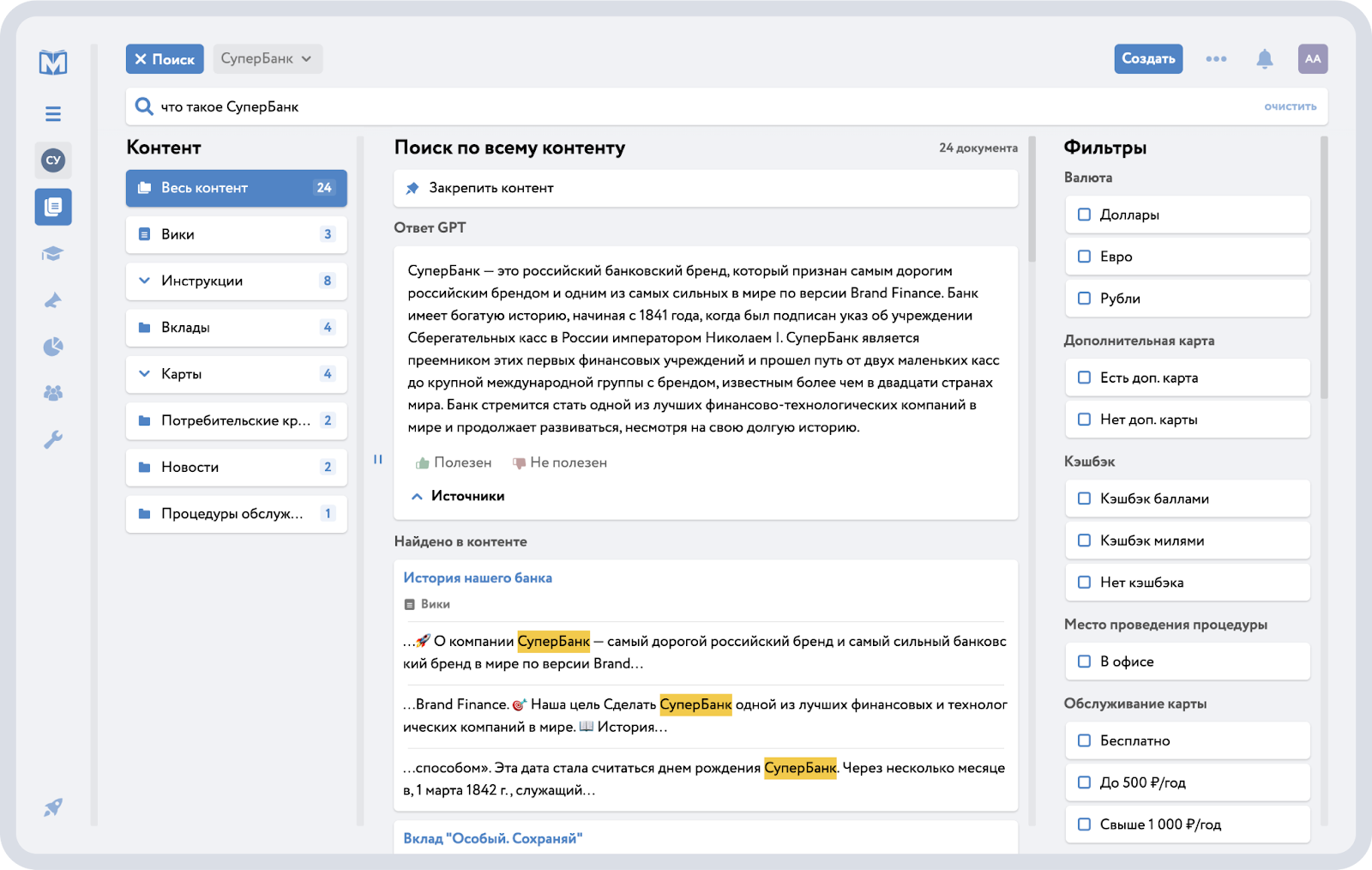 Система также предоставила возможность анализировать поисковые запросы и оценивать полезность контента, собирать обратную связь для совершенствования статей. А умный поиск с поддержкой синонимов позволил сотрудникам быстро находить нужную информацию.